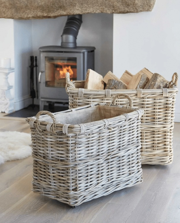 سبد حصیری در کنار بخاری هیزمی با طرحی جالب، می تواند دکوری بی نظیر برای منزل  شما باشد.