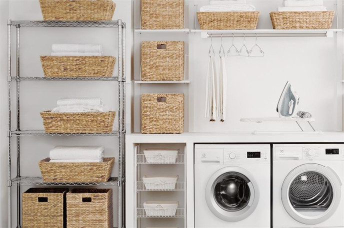 سبد حصیری در لاندری روم را برای قرار دادن لباس، ملحفه، حوله و مواد شوینده و بهداشتی به کار ببرید.